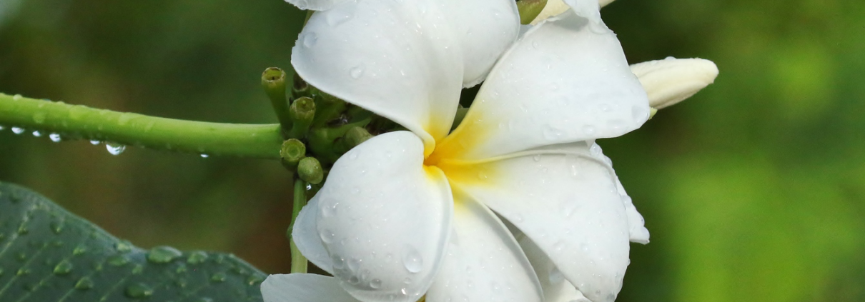 Claudine saugt den Duft der weißen gelbäugigen Frangipani ein.